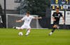 Sophomore midfielder Ian Shaul swings his leg into the ball during Notre Dame’s 3-2 defeat of Wright State at Alumni Stadium on Sept. 23, 2025.