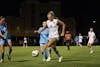 Sophomore forward Izzy Engle, Notre Dame’s leading scorer, looks after the ball during Notre Dame’s 4-3 defeat of North Carolina at Alumni Stadium on Sept. 24, 2025.