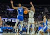Duke forward Maliq Brown knocks the ball out of the hand of junior guard Braeden Shrewsberry during the Irish’s 100-56 loss to the Blue Devils in Purcell Pavilion on Feb. 24, 2026.