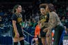 Irish head coach Niele Ivey addresses graduate and junior guards Vanessa de Jesus and Hannah Hidalgo during Notre Dame’s 80-70 victory against Virginia Tech on Feb. 5 in Purcell Pavilion.