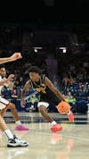 Freshman Jalen Haralson guides the basketball into the net during the Irish’s home matchup against Eastern Illinois on Tuesday, Nov. 11, 2025. The freshman guard played more than 25 minutes of the game.