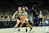 Junior guard Hannah Hidalgo drives with the basketball during Notre Dame's defeat of Michigan at Purcell Pavilion on March 23, 2025.