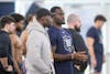 Running back Jeremiyah Love chats with NFL staff during Pro Day on Tuesday.