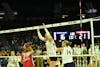 Sophomore middle blocker Grace Langer leaps at the net during Notre Dame’s loss to Louisville at Purcell Pavilion on Oct. 29, 2025.