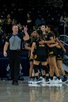 The Notre Dame bench celebrates after getting a successful call in their game against Virginia Tech on Thurs, Feb. 5.