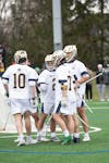 Notre Dame men's lacrosse players strategize during their 9-4 win over Michigan.