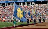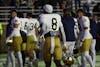 The Irish offense celebrates in the end zone after a touchdown against Navy.