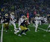Sophomore safety Adon Shuler walks off the field after Notre Dame's 25-10 victory over Boston College at Alumni Stadium on Nov. 3, 2025. Shuler secured a pivotal interception in the Irish win.