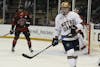 Freshman forward Pano Fimis looks to his right during Notre Dame’s 8-2 defeat of St. Lawrence at Compton Family Ice Arena on Oct. 16, 2025.