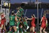 Sophomore forward Annabelle Chukwu rises for the header in Notre Dame's 3-1 victory over Louisville in Alumni Stadium on Oct. 3, 2025. Chukwu scored the decisive goal against the Blue Devils to advance the Irish into the final.