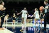 Senior guard KK Bransford high-fives her teammates during Notre Dame's 98-52 defeat of FDU at Purcell Pavilion on Nov. 5, 2025.
