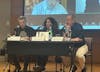 Professors Laurie Nathan, Atalia Omer and Asher Kaufman discussed the Israel Hamas ceasefire in a lecture for the Kroc Institute. Projected on the screen behind them were Mkhaimar Abusada, a professor at Al-Azhar University in Gaza, and Rami Khouri, a public policy fellow at the American University of Beirut, who joined the conversation virtually via Zoom.