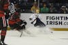 Junior forward Evan Werner carries the puck in Notre Dame’s dominant 8-2 victory over St. Lawrence inside Compton Family Ice Arena on Oct. 16, 2025. Werner already has three goals and four assists in 2025.