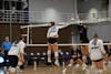 Junior middle hitter Carolina Carens goes for the kill in Belles' 3-0 loss to Alma at Angela Athletic & Wellness Complex on Sept. 30, 2025. Carens has logged 266 kills in 24 matches in 2025.